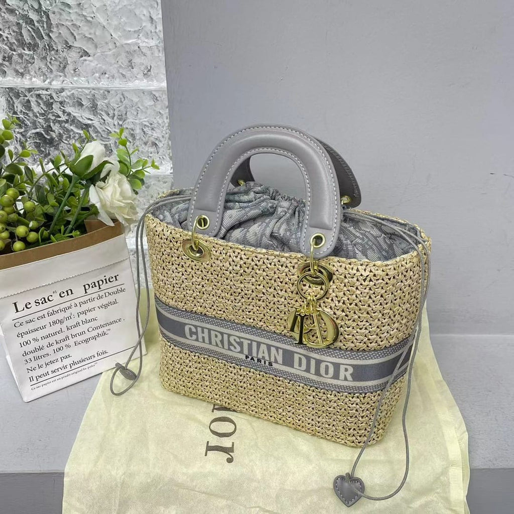 The Lady Dior bag epitomizes Dior's vision of elegance and beauty. Sleek and refined, the timeless style exemplifies the House savoir-faire with hand-woven natural wicker. Featuring leather handles and an interior drawstring pouch in blue Dior Oblique jacquard, the design is enhanced by an embroidered Christian Dior signature band, inspired by the Dior Book Tote. A wide, removable embroidered strap allows the miniature bag to be carried in the hand, over the shoulder or crossbody.
