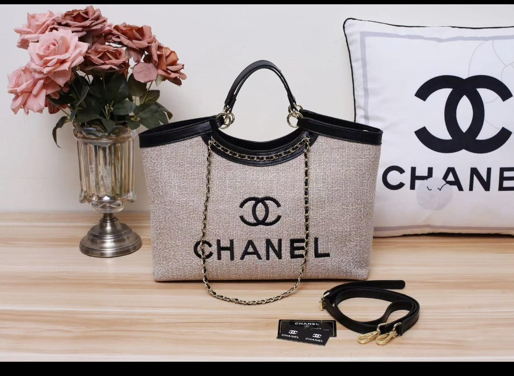 This satchel features a canvas body with leather trim, rolled handles, curb chain straps, an open top with a magnetic snap button closure, and interior zip and slip pockets.