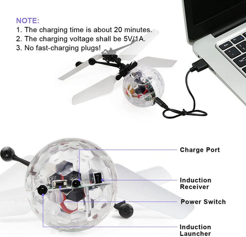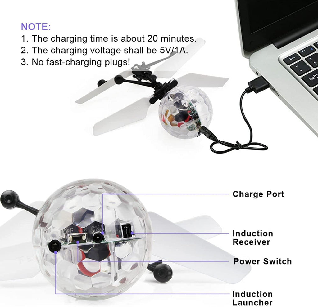 Rechargeable Led Light Ball : Flashing led light plus a glass ball appearance design which will emit bright shining and colorful light. It has a great visual appeal for children and adults. You only need to connect it to a USB connector for 20-25 minutes. Fantastic led RC flying helicopter ball!
