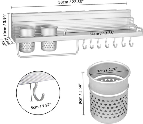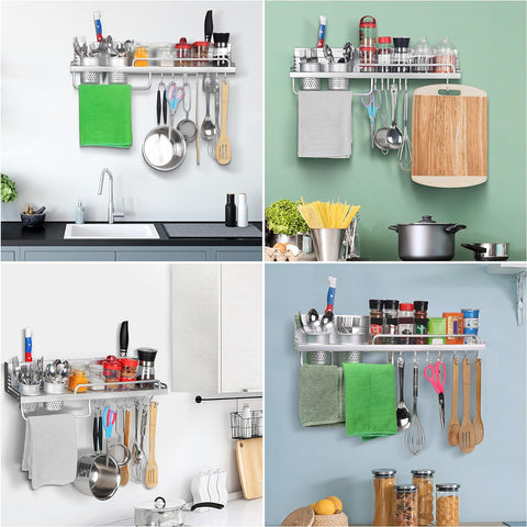 Multifunctional Wall Mount Aluminium Hanging Utensil Display Rack Shelf Organizer for Ladles Spoons Pans Spices Cutlery Cookware with Knife and Hand Towel Holder