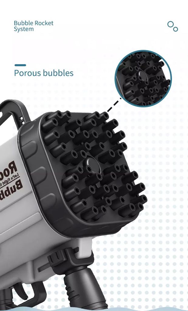 、Powered by lithium battery: Interesting leaf blower that produces a stream of bubbles. With realistic design and fresh colors, this toy bubble blower is what you need. tap the bubble liquid and pull the trigger, a lot of bubbles will be ejected!