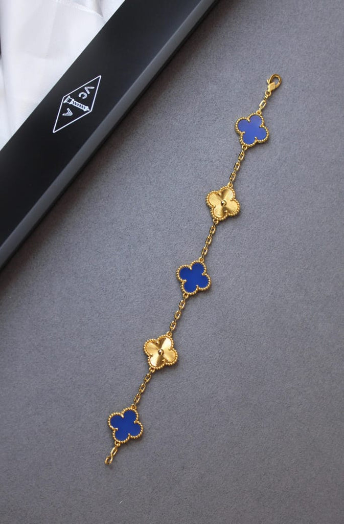 Embrace timeless elegance with the Van Cleef & Arpels 5 Motif Bracelet, a stunning piece that harmoniously blends vibrant blue agate with lustrous gold. Each exquisite motif showcases the brand’s iconic Alhambra design, symbolizing luck and enduring beauty.
