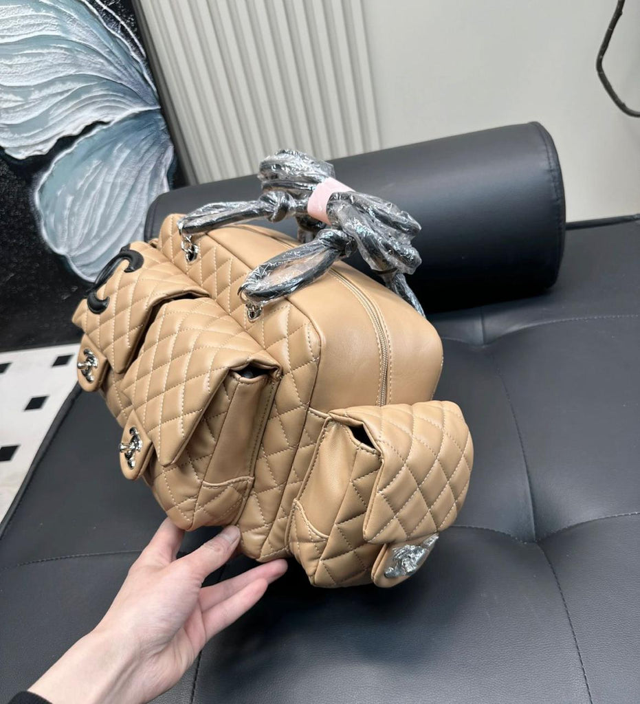 The Chanel Ligne Cambon bag has a huge fan following. This beige leather bag draws inspiration from classic utility bags and has the iconic Chanel quilted pattern. It has abundant exterior multi-pockets with CC turnlock closures offering you absolute convenience to keep your essentials. Luxurious yet utilitarian, it has top handles and silver-tone hardware.