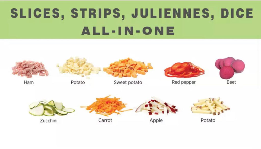 - ▶【ALL-IN-ONE MANDOLINE SLICER】The mandolin slicer is convenience and versatility. It's a all–in–one safe adjustable mandolin slicer for kitchen.Only by changing the blades type and pressing the handle, you can cut various vegetables, fruits and meat into a unique shape and thickness that best suit your desire, such as slices, strips, julienne, and dices. No tedious cleaning work, you can rinse it by water.