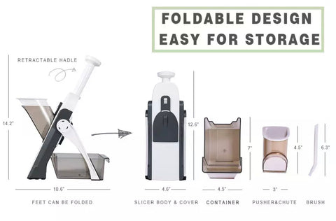 - ▶【Portable PERFECT DESIGN】Our slicer vegetable cutter can retractable handle and folding bracket make adjustable vegetable cutter more space–saving,portable and easy to storage.Replaceable stainless steel blades hidden inside the machine to prevent injury.Independent delivery pusher can push all the vegetables and fruits into the cut to prevent waste.The bottom of the cutter has suction cup feet to ensure stability when in use.