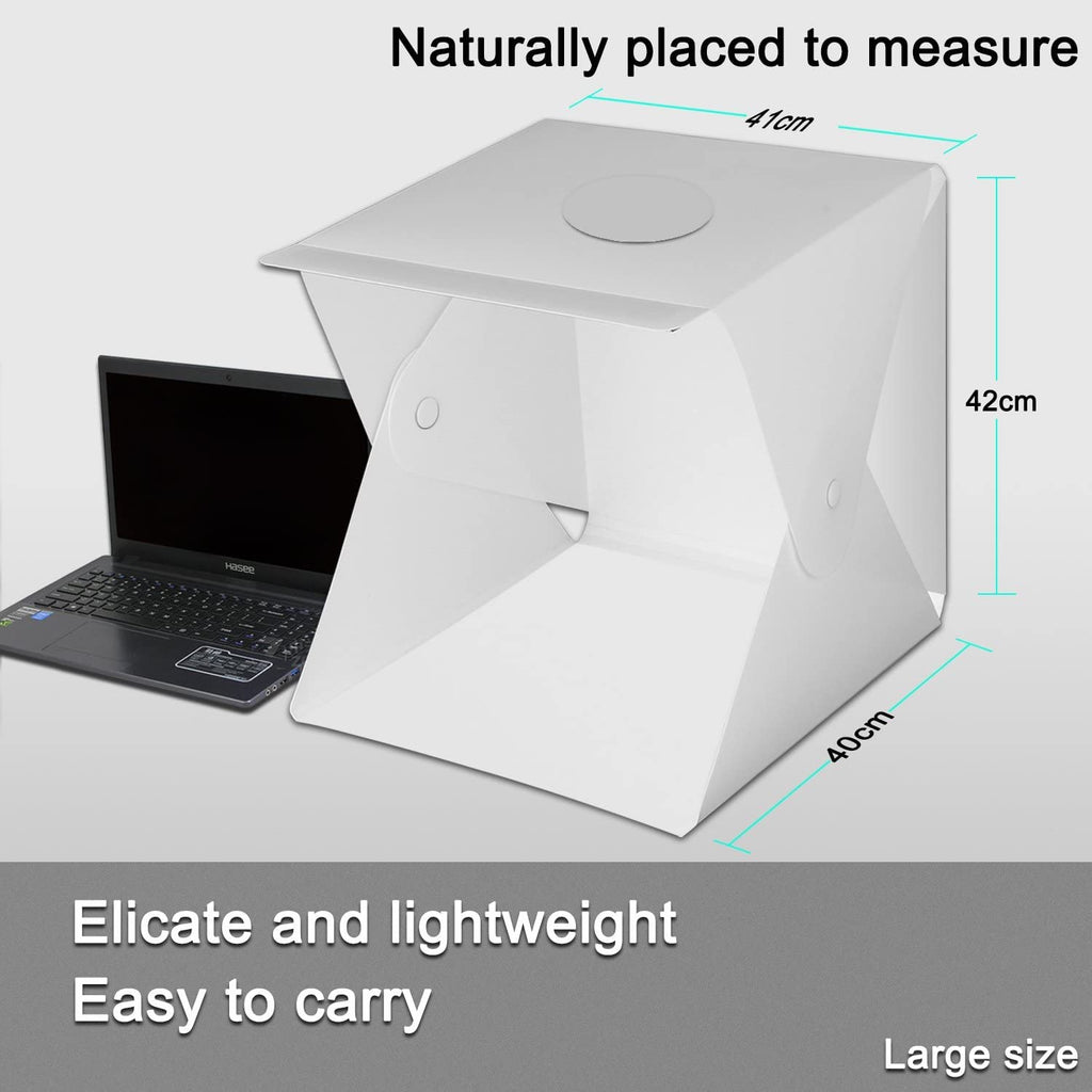 KIT INCLUDES: 1 Photo Light Box 16 inches (40cm) 16” x 16”x 16”, 1 USB Power port cable connected to any USB ports, 2 Color Backgrounds (Black, White), 1 Carry case bag.
