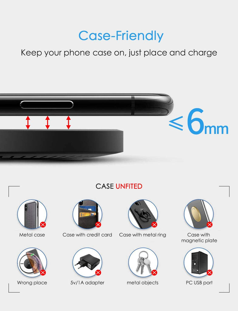 Built-in Protection System : Qi charger features over-charging and over-heating protection. Auto standby mode when fully charged, which protects your phone and the induction charger. (Please remove the phone case or ensure the case is less than 4mm/0.16 inch thickness and does not contain metal or magnet)