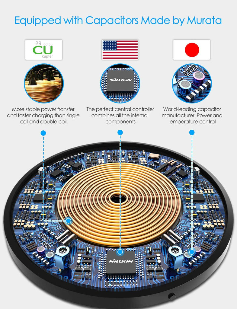 Faster Wireless Charging : 10W charging pad for Galaxy S10/S10 Plus/S10 E/S9/S9 Plus/S8/S8 Plus/Note 8/S7/S7 Edge (QC 2.0/3.0 adapter needed). 7.5W standard charging for iPhone Xs/Xs Max/XR/X/8/8 plus(Running iOS 11. 1. 2 and later)/New AirPods and 5W for other Qi-enabled phones. Higher efficiency than other wireless chargers.